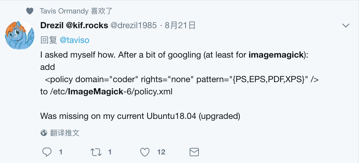 按照建议的临时解决方案(https://www.kb.cert.org/vuls/id/332928 )针对装有ImageMagick的机器改一下 /etc/ImageMagick/policy.xml 配置文件,禁用以下编码器。