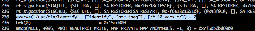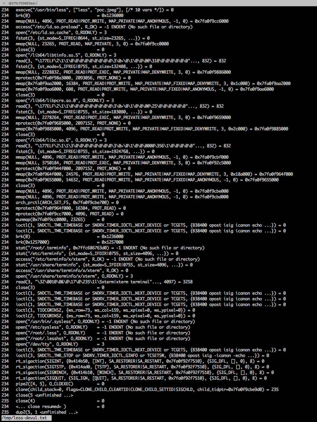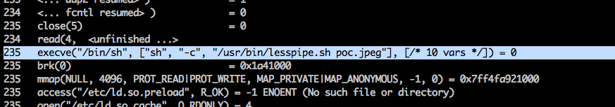 strace -f -o /tmp/less-devul.txt less poc.jpeg