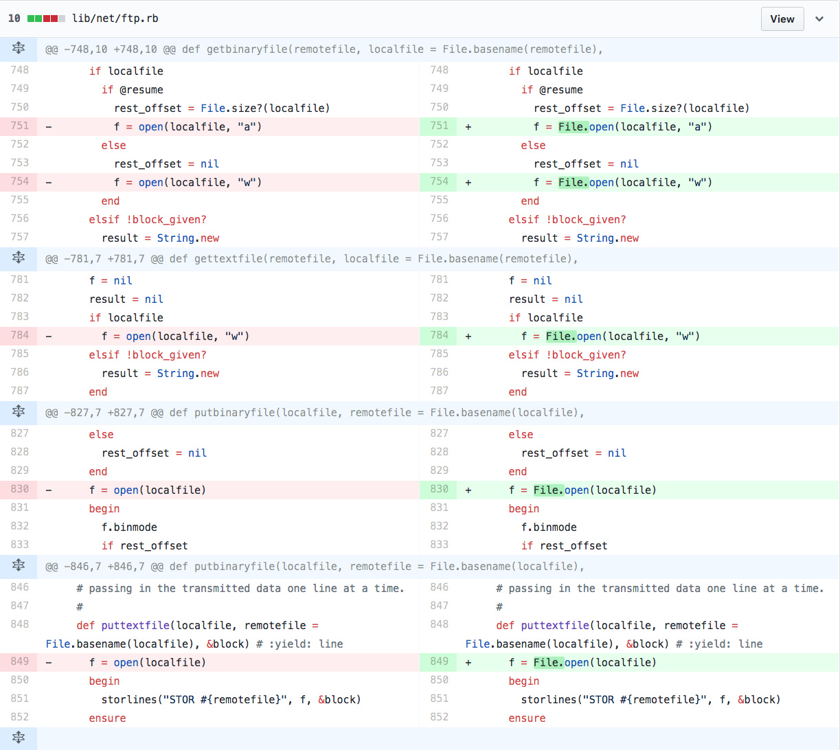 Ruby 在 GitHub 中到项目在14号提交了fix Fix a command injection vulnerability in Net::FTP. · ruby/ruby@6d3f72e,可以看到几处原本使用open()现在改为了File.open(),之前没有接触过Ruby,奇怪为什么open()竟有执行命令的能力?